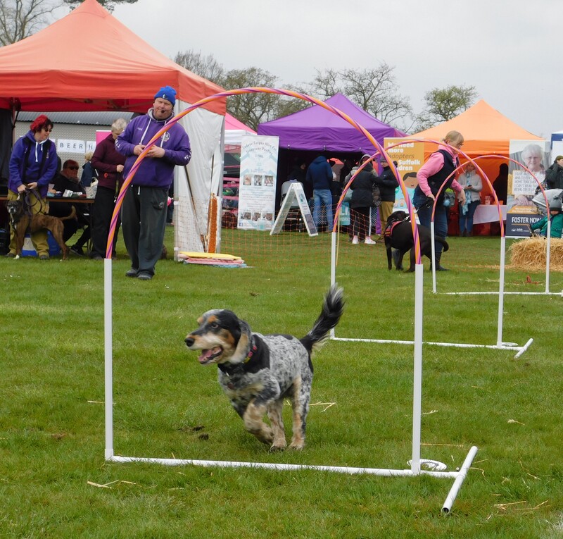 Hoopers is a new up and coming dog activity from the USA. It is a low impact sport and as such was designed for young dogs not yet old enough to do agility (6 months min) and veteran dogs who are no longer able to compete at agility. It is also suitable for dogs that have injuries. Hoopers involves going through hoops and small tunnels and round objects such as cones and barrels. It encourages the dogs to work away from you and the ultimate aim is for the handler to stand in one place and the dog completes the course around them. Dogs must be vaccinated and over 6 months to take part.